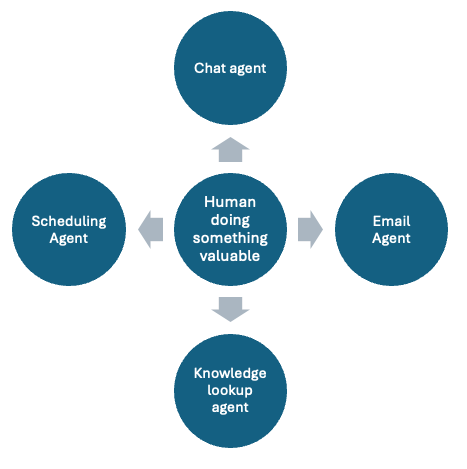 It is, again, an inversion of how Microsoft envisions the future. They see a workforce of managers keeping an eye an AIs doing valuable work. What I see is people who are freed to focus on the most valuable thing they bring to their job, whatever that may be, surrounded by an array of AI agents who are giving them the space to do what only they can do. It would look something like this: