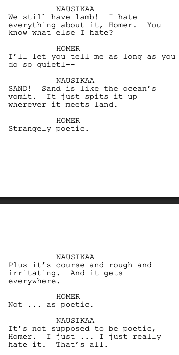But our characters don’t reach Ithaka until page 105, which means I have roughly 15 pages (18, in the final count) to have a resolution to Nausikaa’s story, have some kind of romance between Leia and Homer, AND introduce Penelope and her story AND resolve them. It’s just too much.